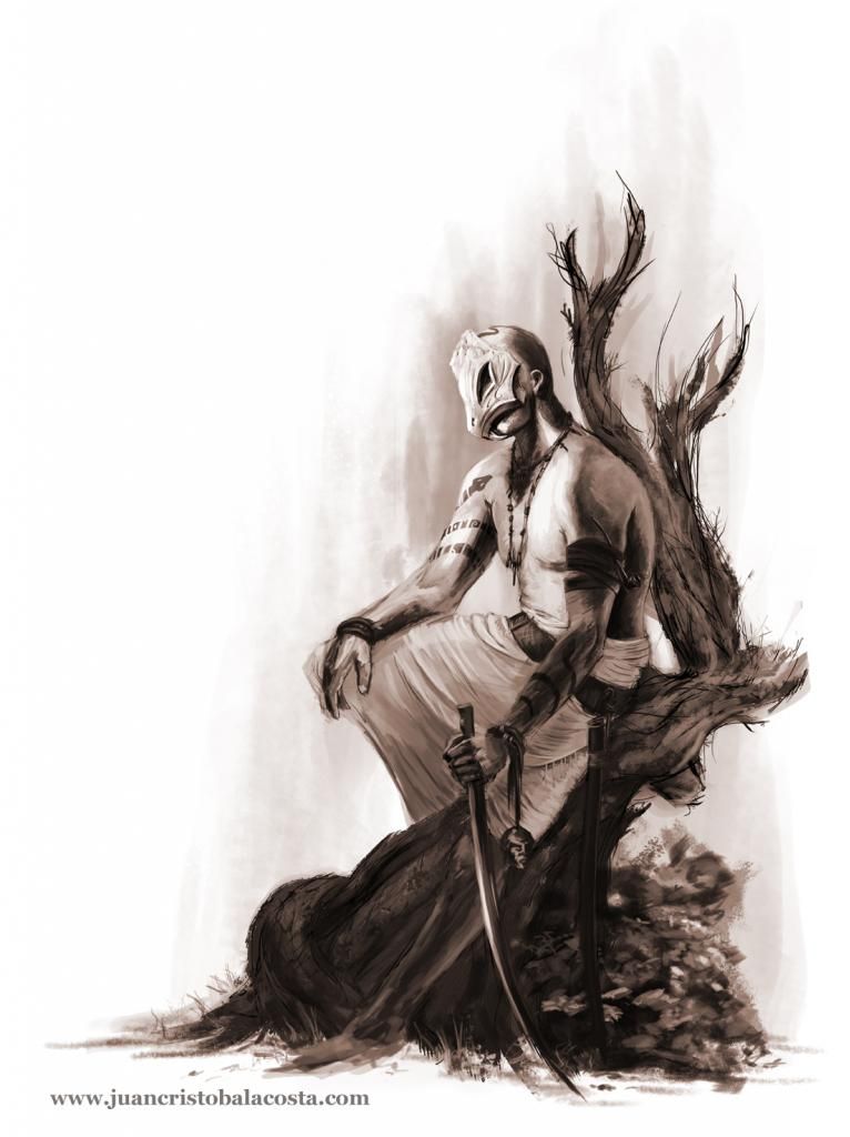 Nueva trabajo, una ilustracion interior para un juego de rol, basado en la novela de Leon Arsenal: "Mascaras de matar". Este personaje en concreto es un cazador de cabezas, cuyo "feral" es la serpiente.